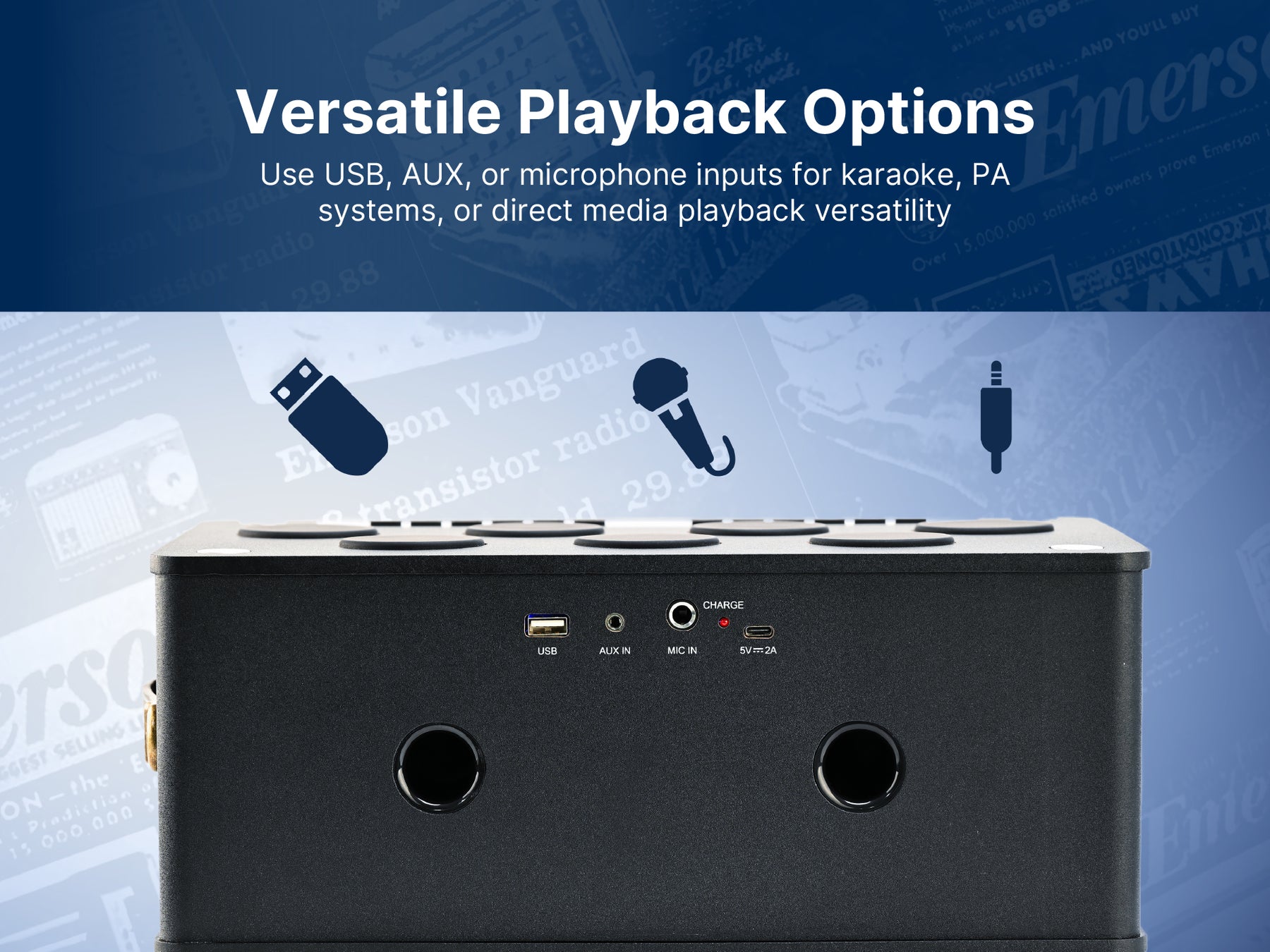 • Versatile Playback Options: Connect your media via USB, AUX input, or microphone input for karaoke-style fun or PA usage.